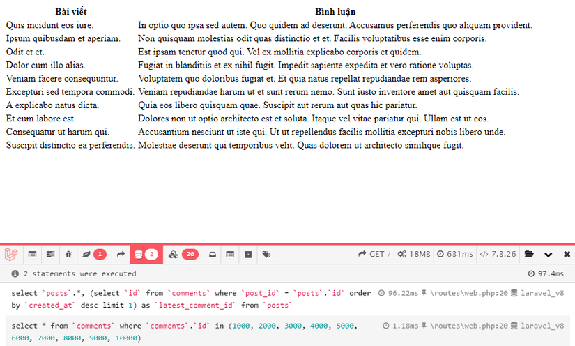 Hola! code đã đẹp và rất dễ đọc. Tuy nhiên (lại tuy nhiên) nếu bạn để ý thấy ta chỉ cần dùng 20 model (10 post và 10 comment mới nhất) nhưng ở đây lại load đến 10010 model, tức là nó sẽ lấy ra 10 bài viết và tất cả bình luận của 10 bài viết đó 😱😱 Nếu bạn có một máy chủ không giới hạn dung lượng, việc này không sao, tuy nhiên nó sẽ làm giảm đáng kể khả năng xử lý và có vẻ không ổn, Hãy luôn ghi nhớ: