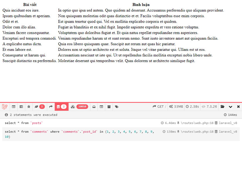 Như bạn thấy, chúng ta đã giảm lượng truy vấn xuống còn 2 truy vấn, bạn cũng có thể tối ưu cho code đẹp hơn bằng cách tạo quan hệ hasOne giữa 2 đối tượng.