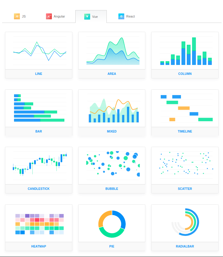 - Ấn tượng đầu tiên của mình về về Apex là về thẩm mĩ, so với 2 cái tên mình nói ở trên là Chartjs và Chartist thì rõ ràng các bạn có thể thấy rằng Apex đẹp hơn rõ ràng. Và tùy vào dự án của bạn, Vue/Angular/React/JS thì Apex cũng có sẵn demo và code mẫu cho bạn tham khảo