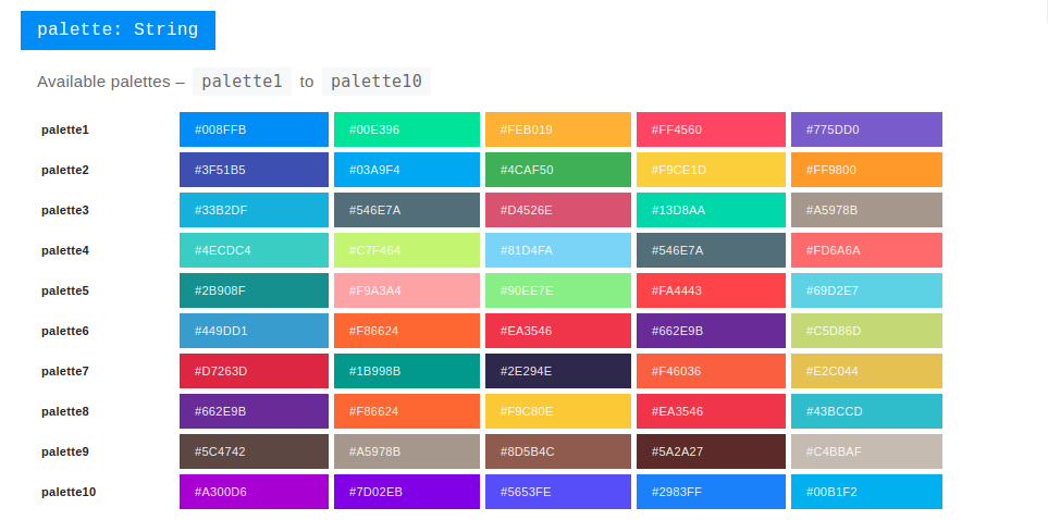 Bộ màu và mã màu cụ thể của 10 palette: https://apexcharts.com/docs/options/theme/#palette