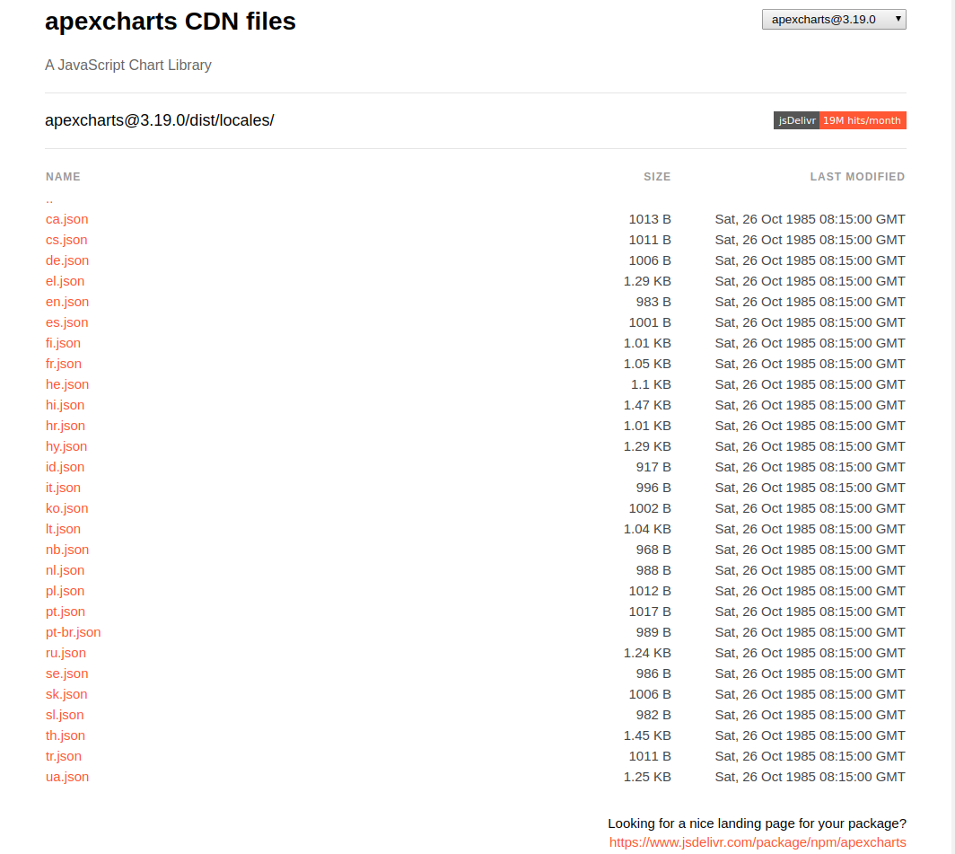 /dist/locales.var fr = require("apexcharts/dist/locales/fr.json") { chart: { locales: [fr], defaultLocale: 'fr', } } - Nếu muốn sử dụng cdn thì bạn có thể vào đường dẫn https://cdn.jsdelivr.net/npm/apexcharts/dist/locales/ để tìm ngôn ngữ mà mình cần: