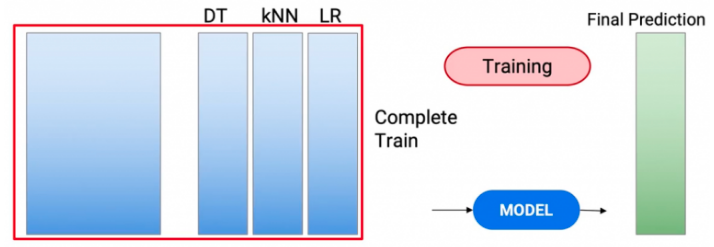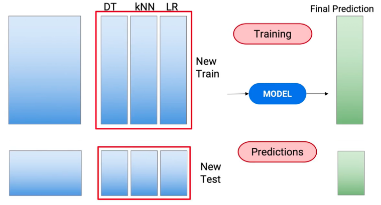 Có nghĩa Meta-model được huấn luyện dựa trên đầu ra dự đoán của các base-modes, các outputs này kết hợp với nhãn của bài toán tạo thành cặp dữ liệu đầu vào - đầu ra trong quá trình huấn luyện Meta-model. Có thể thấy Meta-model không học trực tiếp từ tập dữ liệu huấn luyện, tuy nhiên, việc dùng dữ liệu bàn đầu thêm vào outputs của base-models vẫn hoàn toàn hợp lý, sẽ cấp thêm cho meta-model nhiều thông tin hơn về dữ liệu.