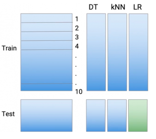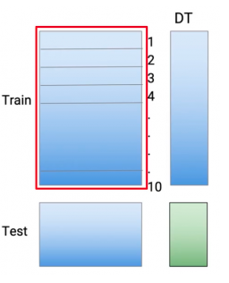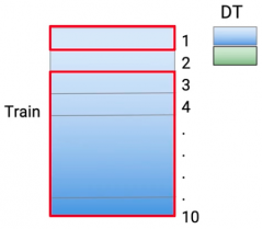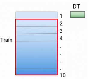 Tại đây, 9 phần sẽ được sử dụng để huấn luyện base-models và predicted trên phần còn lại, ở đây, base-model đầu tiên được sử dụng là Decision Tree. Đầu tiên từ phần 2-10 sẽ được huấn luyện với Decision Tree và predicted trên phần thứ 1