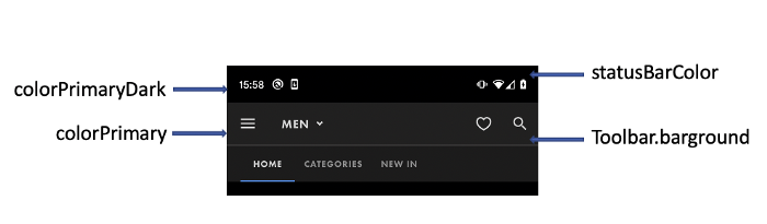 Ngoại trừ những thay đổi về theme, hầu hết thời gian, giao diện người dùng của bạn sẽ không có bất kỳ kết nối hoặc chồng chéo nào với các thanh hệ thống. Nếu bạn muốn thay đổi riêng màu thanh trạng thái và màu thanh điều hướng, có hai cách bạn có thể thay đổi chúng ngoài màu mặc định colorPrimaryDark. Một được đặt theo kiểu ứng dụng như bên dưới