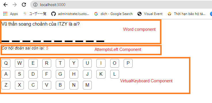 Trong source code của mình, bạn có thể nhìn thấy cả 4 component trên trong file Game.js . Chúng tương ứng với các function _renderWord , AttemptsLeft, VirtualKeyboard và _renderGameFinished .