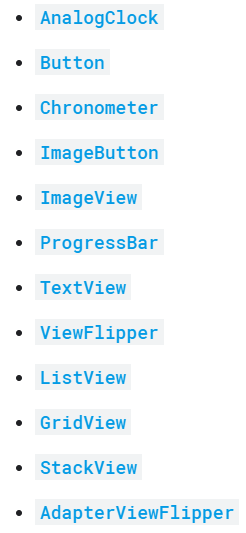 Cũng do những giới hạn về cử chỉ mà widget chỉ hỗ trợ những layout và component sau: