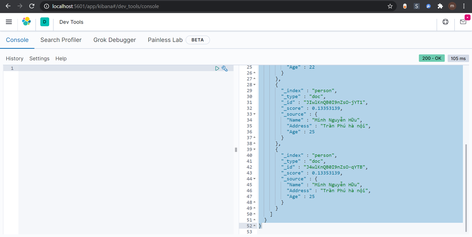 Truy cập vào devtool trên kibana: http://localhost:5601/app/kibana#/dev_tools/console