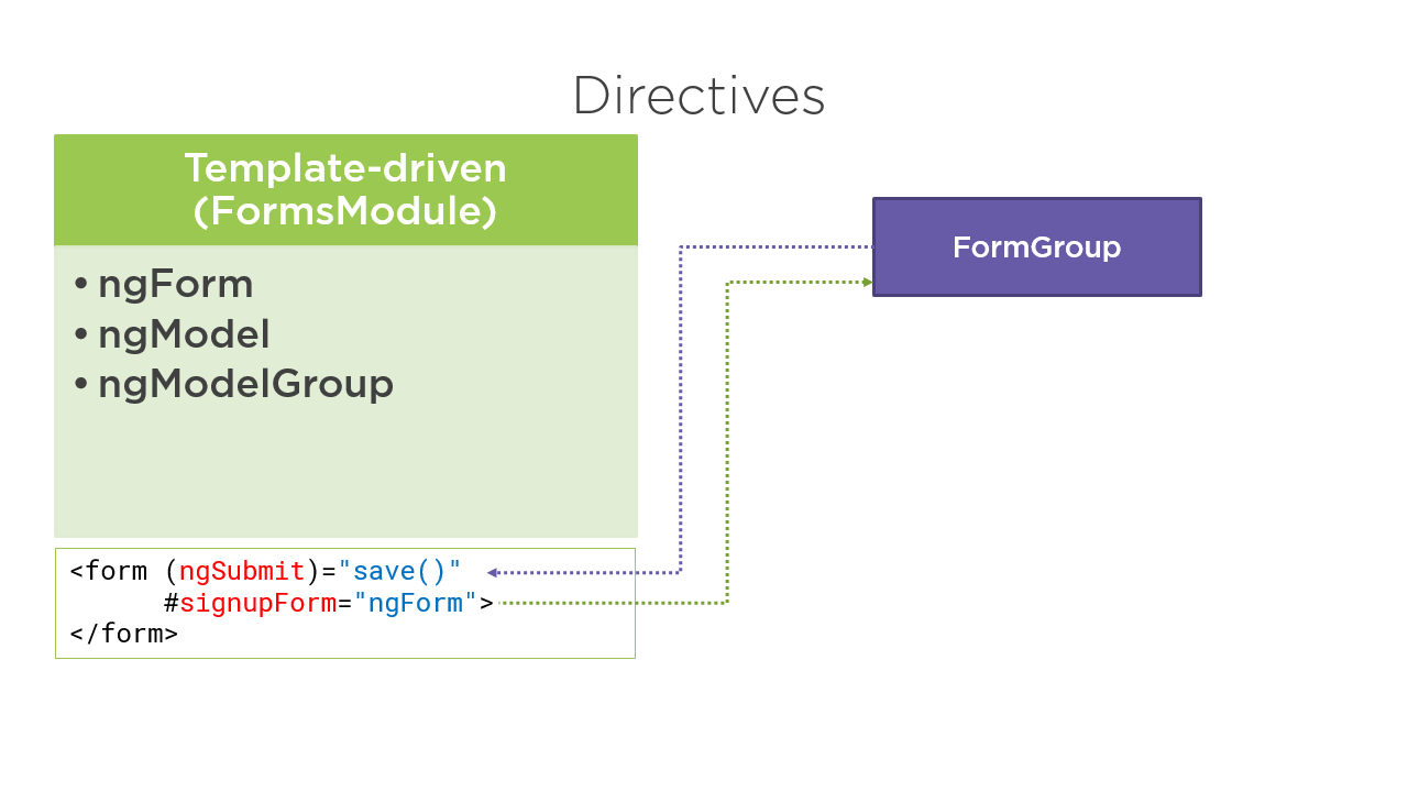 - Template-driven form là phương pháp mà chúng ta sẽ tạo forms dựa vào template (giống như trong Angularjs). Chúng ta thực hiện việc thêm các directives và hành vi vào template, sau đó Angular sẽ tự động tạo forms để quản lý và sử dụng.