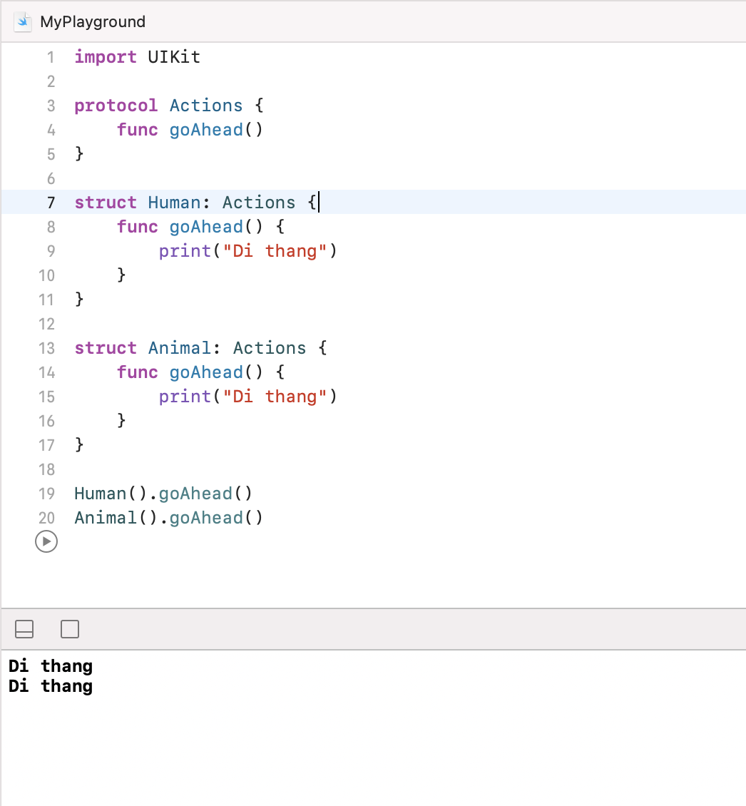 Ở trên, mình có tạo một protocol có tên là Actions, nó đại điện cho một bản thiết kế bao gồm các hành động, kịch bản ở đây sẽ là tạo một bản thiết kế bao gồm các actions, mà có thể dùng cho cả người mà động vật. Tiếp theo, mình sẽ tạo một struct có tên là Human, sau đó mình sẽ adopt function goAhead(). như sau: