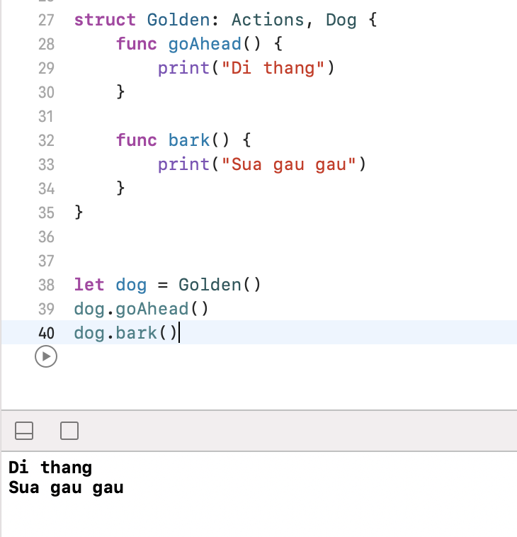 Ngoài ra, chúng ta cũng có thể thêm các function khác cho protocol (Additional functionality) để các class/struct/enum mà đang adopt nó đều có thể sử dụng được. Ở extensions Dog phía trên, mình sẽ thêm 1 func nữa:
