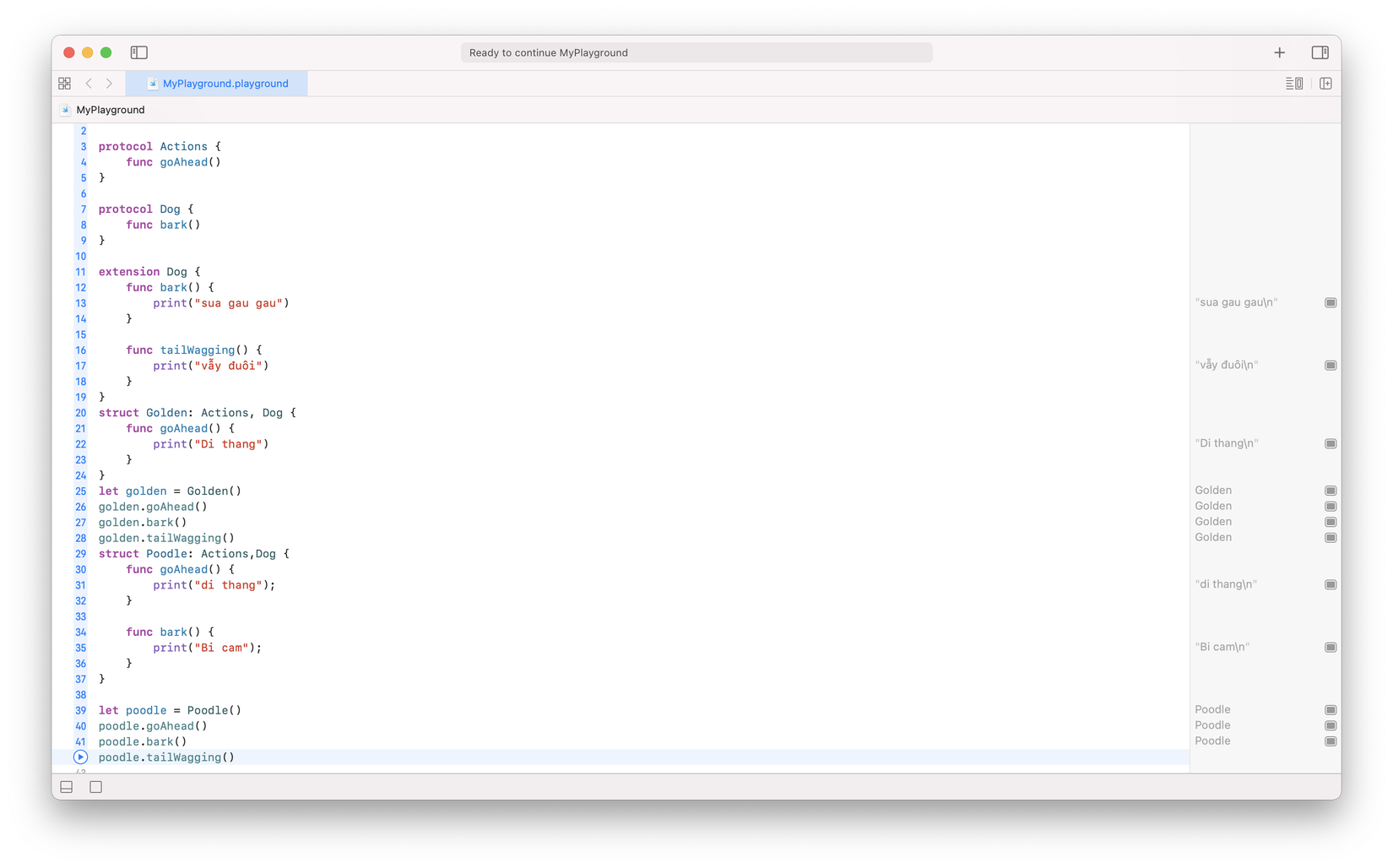 Như ví dụ trên thì chúng ta có thể thấy rằng, việc khởi tạo code của function bark bên trong extension thì nó ngầm hiểu rằng các class/struct/enum sẽ không cần phải thêm function đó bên trong nó (Optional protocol functions), mà nó sẽ sử dụng luôn function đã được định nghĩa bên trong extension. Tuy nhiên nếu như với giống chó bị câm, ở đây mình sẽ tạo ra một con chó Poodle, không hề biết sủa.