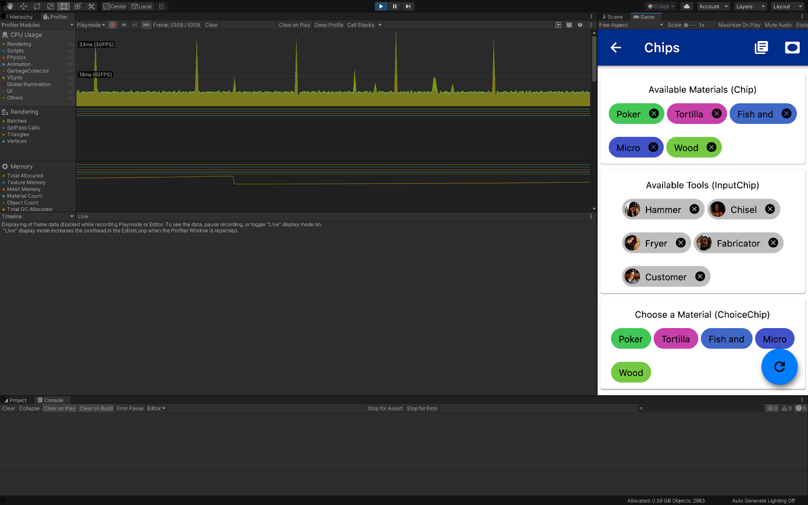 Ứng dụng UIWidgets có thể được gỡ lỗi trực tiếp trong Unity Editor bằng nhiều công cụ nâng cao như Cấu hình CPU / GPU, Cấu hình FPS.