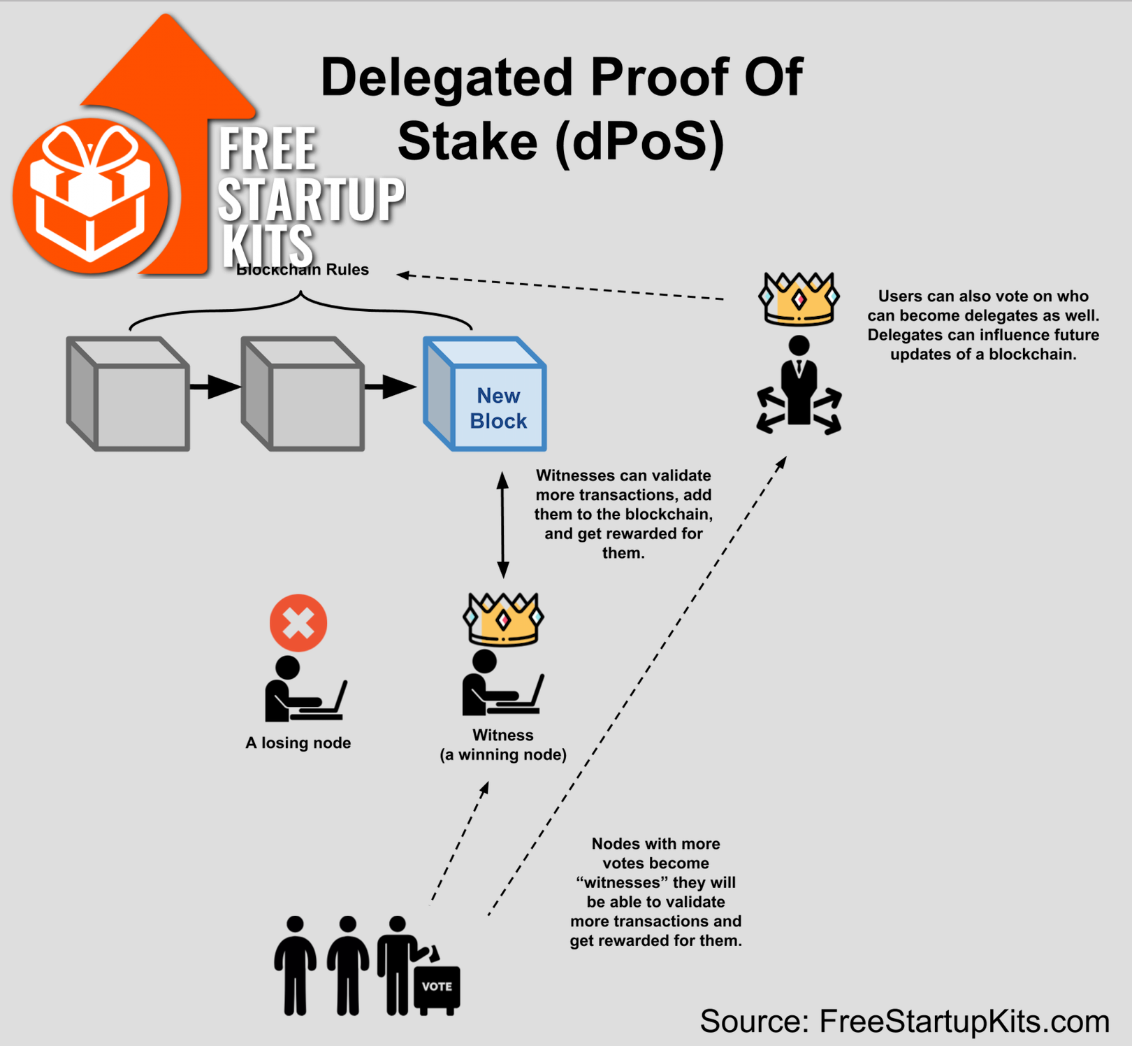 - DPoS rất khác biệt so với PoW và thậm chí cả PoS. Trong hệ thống này, việc các chủ sở hữu cổ phần bầu chọn là một cách thức để tìm ra và thúc đẩy những đại diện (hoặc nhân chứng) trung thực và hiệu quả. Tuy nhiên, việc tạo ra khối mới thực sự khác so với các hệ thống PoS và trong phần lớn các trường hợp, nó mang lại hiệu suất cao hơn tính theo số lượng giao dịch được thực hiện mỗi giây.