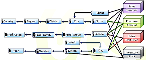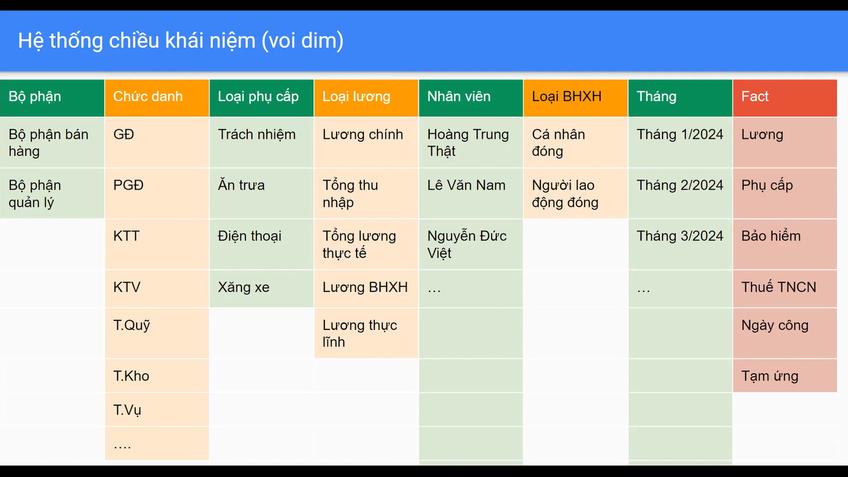 Bên tay phải có Fact (chủ điểm phân tích), và bên tay trái là Dim (chiều dữ liệu). Trong mô hình này, chúng ta hệ thống lại các chiều dữ liệu và các cấp nhỏ hơn của mỗi chiều. Cùng với đó là sự liên hệ với các chủ điểm phân tích trong hệ thống dữ liệu.