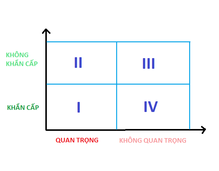 Có một số người rất giỏi trong việc xử lý nhiều vấn đề trong một khoảng thời gian ngắn. Mình dùng từ "khoảng thời gian ngắn" chứ không phải là "cùng một lúc" là có nguyên nhân, vì... bạn đã thấy ai, tay trái vừa giải phương trình, tay phải sáng tác thơ chưa? Nếu thấy rồi, thì đúng... đó là nhân vật Chu Bá Thông trong tác phẩm Thần điêu đại hiệp của cố nhà văn Kim Dung. Còn ở ngoài đời thật, rất khó để tìm thấy một thiên tài như vậy. Nhưng vì sao người ta vẫn có thể làm rất tốt nhiều việc gần như là đồng thời? bí quyết nằm ở sự tập trung. Chỉ có tập trung, ta mới có thể hoàn thành một công việc, vừa tối ưu nhất, trong khoảng thời gian ngắn nhất, để có thể xử lý công việc tiếp theo. Xung quanh chúng ta, có rất nhiều thứ ập đến, mà không hề nể nang cân nhắc bạn đang bận. Nếu bạn cứ cố làm việc này một chút, làm việc kia một chút, thì khả năng cao là bạn cũng sẽ chỉ có một chút kết quả thôi. Hãy phân loại công việc của mình thành 4 phần như biểu đồ dưới đây:
