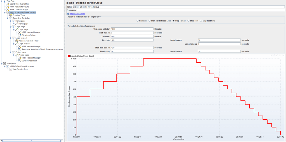 Stepping Thread Group cho phép bạn định cấu hình bao nhiêu Threads để bắt đầu, bao nhiêu nên được thêm theo thời gian để đạt đến mức tối đa, ramp-down là bao lâu. Do khả năng ramp-down của nó mà Stepping Thread Group hoàn hảo để kiểm tra phục hồi hệ thống.