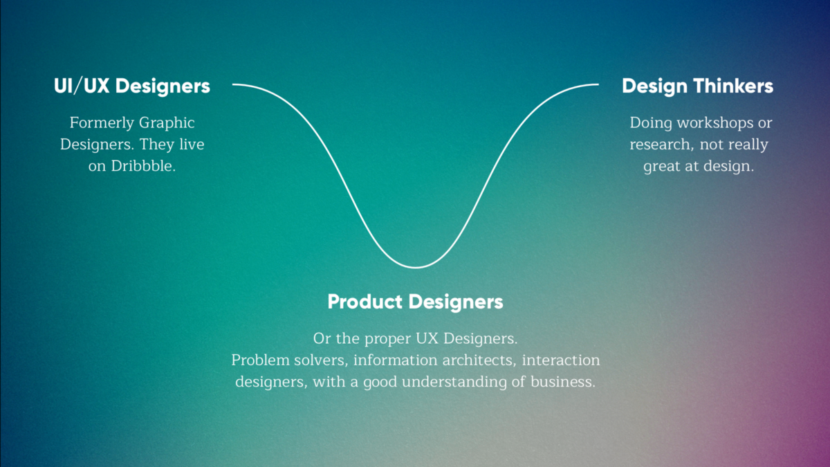 - Có khá nhiều Nhà tư tưởng thiết kế hoặc Nhà thiết kế dịch vụ - những người chuyên thực hiện các hội thảo hoặc nghiên cứu thiết kế, nhưng không thực sự có kinh nghiệm trong việc thiết kế bất cứ điều gì chi tiết (và đặc biệt là kỹ thuật số). Không có gì sai với điều đó, nhưng chúng tôi không tìm kiếm những người như vậy.