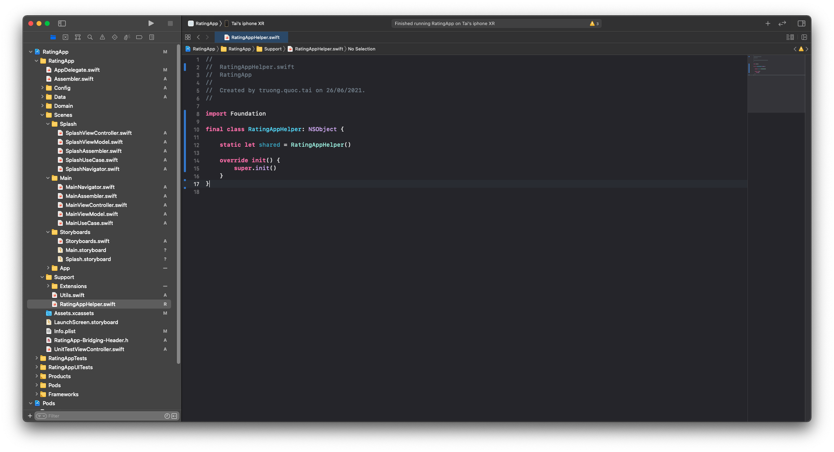 Tạo mới project (trong bài viết đặt tên là RatingApp). Sau đó tạo final class RatingAppHelper.swift và tạo instance cho class này.