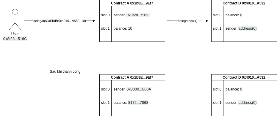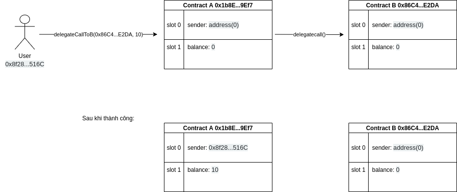 user_addressnào đó (có địa chỉ0x8f287eA4DAD62A3A626942d149509D6457c2516Cchẳng hạn) gọi đến functiondelegateCallToB()của A với các tham số là địa chỉ deploy của B và mốt số nguyên là 10 chẳng hạn =>delegateCallToB(B_contract_address, 10). - truy vấn
