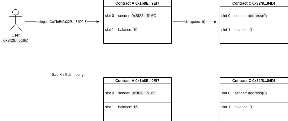 Như vậy, điều đó hoàn toàn đúng với tính chất của delegatecall() mà ta đã nói ở trên.
