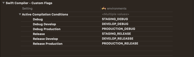 Sau khi đã cấu hình xong các bạn hãy vào Build Settings để thêm các định danh với từng môi trường, nó hỗ trợ trong quá trình xử lý code.