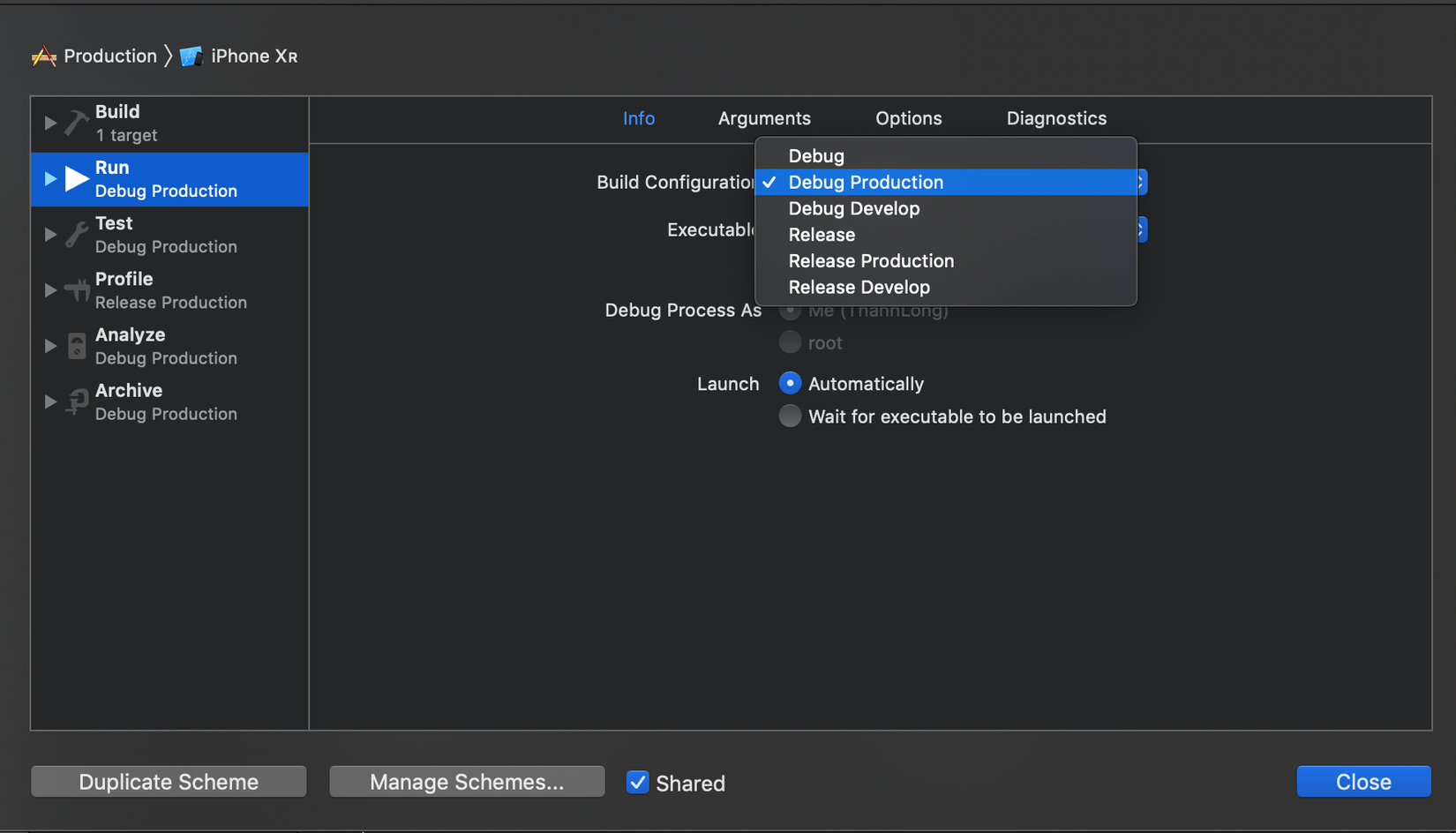 Ứng với mỗi giai đoạn phát triển lại gắn liền với một môi trường. Ví dụ như trong quá trình phát triển và test chúng ta sẽ dùng môi trường staging, khi khách hàng UAT sẽ dùng môi trường Develop, và khi dự án release đưa vào sử dụng sẽ là môi trường Production. Với mỗi môi trường sẽ có server URL khác nhau, việc thay đổi này khá bất tiện trước mỗi lần build. Chính vì thế cần cấu hình vào project của mình, bài viết này sẽ hướng dẫn bằng cách dùng Scheme.