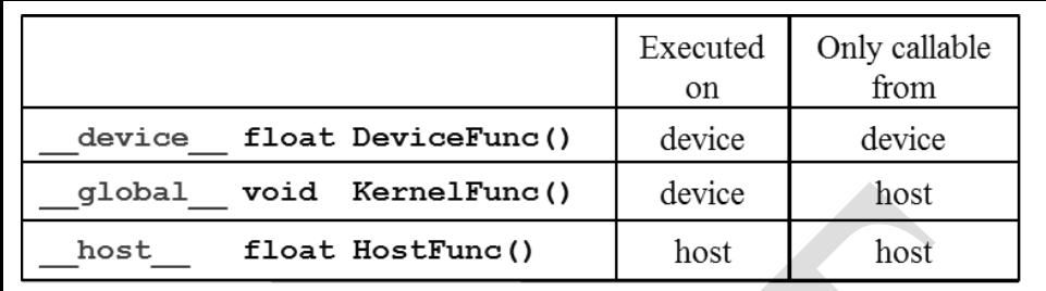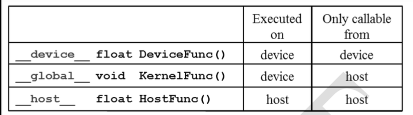 - __ host __ : là 1 normal function được gọi và thực thi trên CPU ( tức là khi các bạn tạo 1 hàm bất kì, nếu không chỉ định gì thêm thì nó sẽ được thực thi ở trên CPU