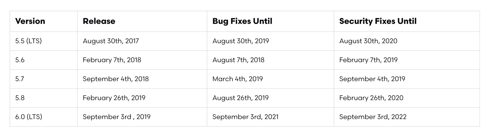 Laravel 6.0 là phiên bản Long Term Support release muộn nhất, có nghĩa là bug fix sẽ được đảm bảo trong hai năm và security fix trong ba năm. Bản phát hành LTS trước đó với những đảm bảo này là Laravel 5.5.