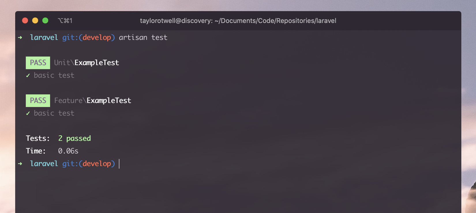 Ngoài lệnh phpunit, từ bây giờ bạn có thể sử dụng lệnh Artisan test để chạy test. Artisan test runner cung cấp giao diện đẹp hơn và hiển thị nhiều thông tin hơn về test đang chạy. Ngoài ra, runner sẽ tự động dừng lại khi gặp trường hợp fail đầu tiên: