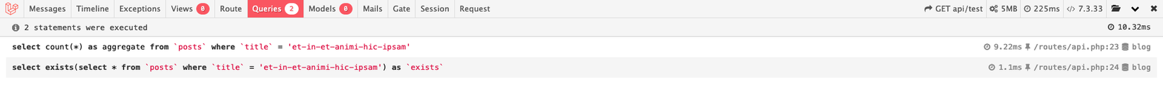 exists()select exists(select * from `posts` where `slug` = 'abc') as `exists`Nếu tìm thấy dòng dữ liệu thỏa điều kiện thì sẽ trả về true, nếu không thì trả về false. Trường hợp tốt nhất là dòng dữ liệu thỏa điều kiện nằm ở đầu của bảng dữ liệu.