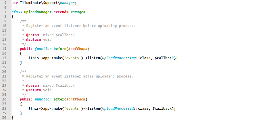 EventServiceProviderclass mà framework cung cấp sẵn). Nói chính xác hơn thì chúng ta sẽ không định nghĩa listeners trực tiếp cho hai events đó mà thông qua cây cầu là các handlers. Ý tưởng ở đây là mỗi listener sẽ nhận vào instance của event hiện tại và cho phép định nghĩa hai phương thức làpreprocessvàpostprocess(tương ứng với các công việc trước và sau quá trình upload). Công việc của chúng ta là điều hướng các listeners đó đúng với các handler cụ thể.