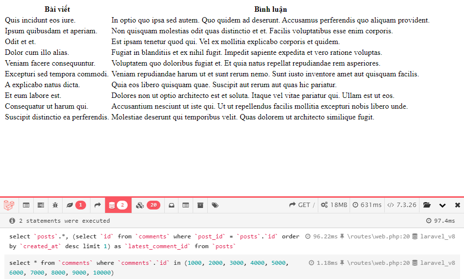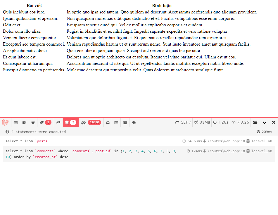 Hola! code đã đẹp và rất dễ đọc. Tuy nhiên (lại tuy nhiên) nếu bạn để ý thấy ta chỉ cần dùng 20 model (10 post và 10 comment mới nhất) nhưng ở đây lại load đến 10010 model, tức là nó sẽ lấy ra 10 bài viết và tất cả bình luận của 10 bài viết đó 😱😱 Nếu bạn có một máy chủ không giới hạn dung lượng, việc này không sao, tuy nhiên nó sẽ làm giảm đáng kể khả năng xử lý và có vẻ không ổn, Hãy luôn ghi nhớ: