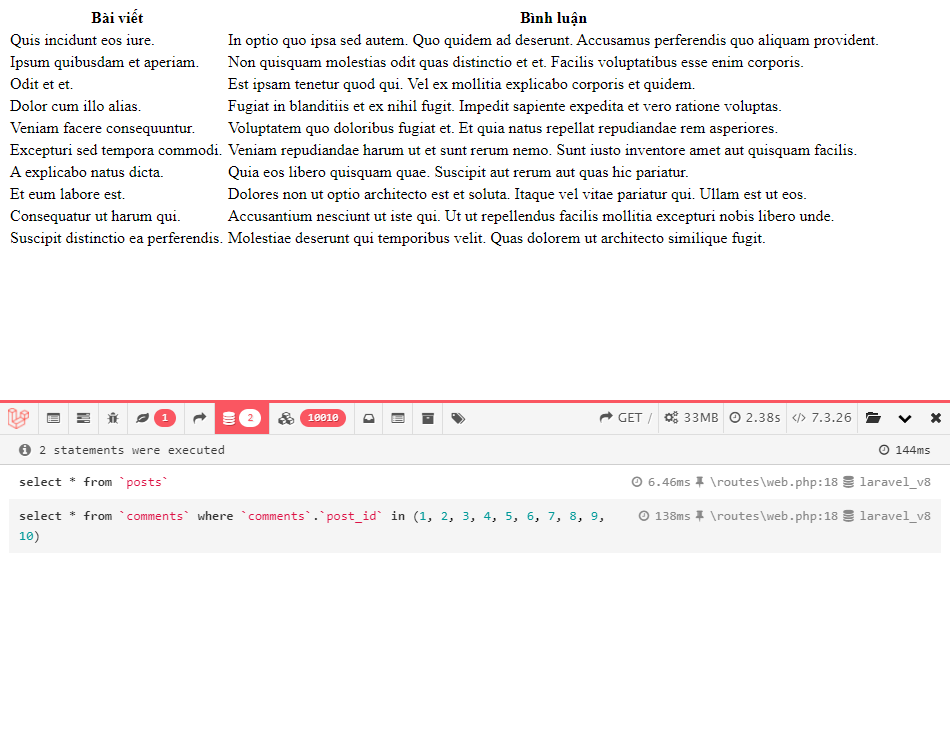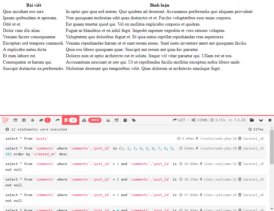 12 lần truy vấn CSDL trong một lần, đối với ví dụ này, số lượng không phải là quá nhiều, tuy nhiên với một số lượng lớp DB đến vài ngàn bài viết thì có vẻ sẽ rất tệ.