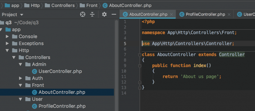 Nhưng nếu chúng ta có nhiều Controllers trong group đó thì sao? Chúng ta có nên tiếp tục thêm Front\SomeController mọi lúc không? Tất nhiên là không. Bạn cũng có thể chỉ định namespace là một trong các tham số.