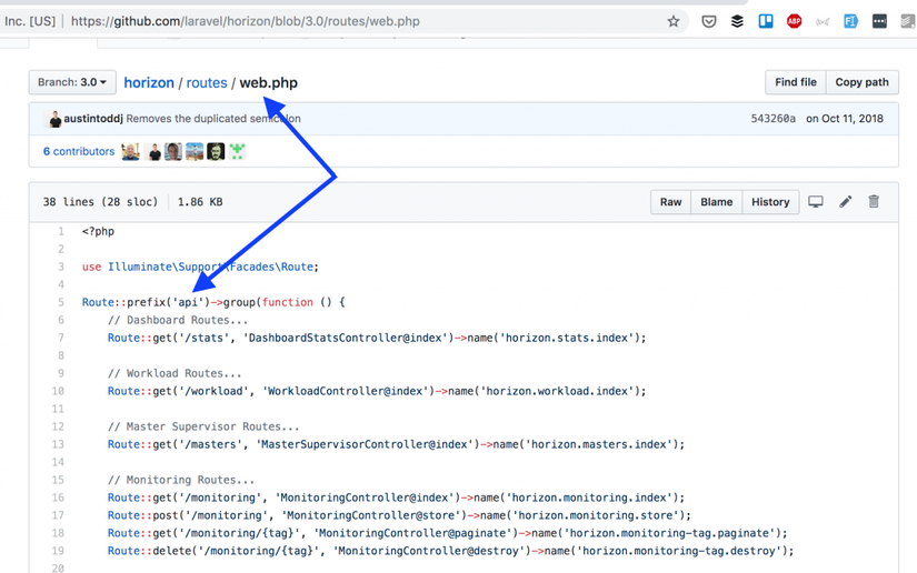 Điều đó có nghĩa rằng, gần đây tôi đã thấy ví dụ phản trực quan từ offical Laravel project. Với Laravel Horizon, Taylor chỉ có các API routes và anh ấy đã không sử dụng file riêng biệt, thay vào đó anh ấy đưa nó vào routes/web.php: