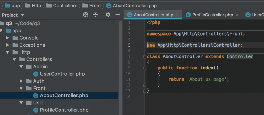 Trong ví dụ trên, chúng ta đã không sử dụng Controllers, chúng ta chỉ trả lại static text như một ví dụ. Hãy thêm Controller, với thêm một "twist" - chúng ta sẽ cấu trúc chúng vào các thư mục với các namespaces khác nhau của chúng, như thế này: