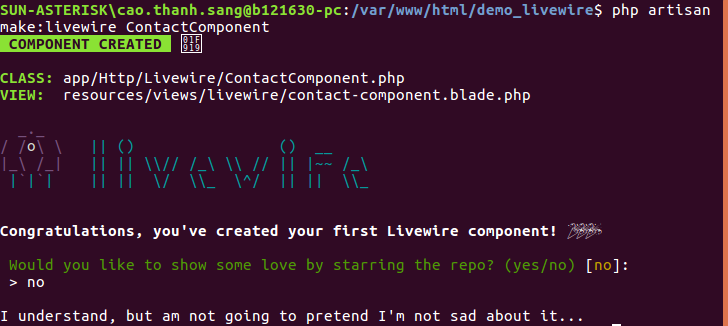 Với lệnh trên chúng ta sẽ có class ContactComponent và view tương ứng. Mọi class được tạo bởi Livewire sẽ được lưu trữ trong thư mục app/Http/Livewire còn view sẽ là resources/views/livewire