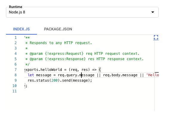 Với code trực tiếp qua editor trên cloud, cloud function hỗ trợ 3 ngôn ngữ là Go, NodeJS và Python. Trong bài viết này tôi sẽ sử dụng NodeJS.