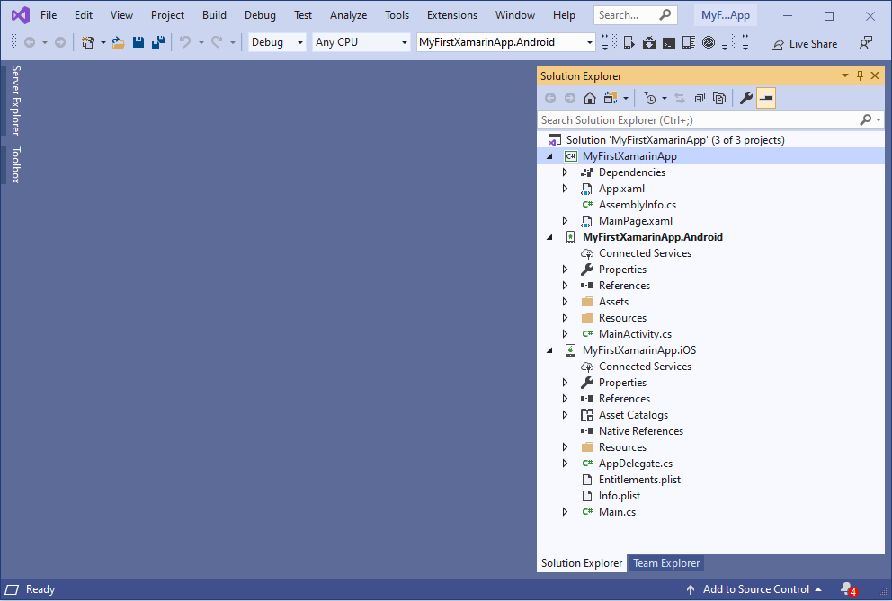 Ví dụ mình tạo project của mình là MyFirstXamarinApp, thì Solution sẽ gồm 3 project con là MyFirstXamarinApp, MyFirstXamarinApp.Android và MyFirstXamarinApp.iOS