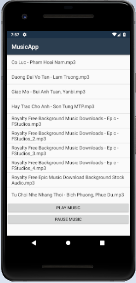 Chúng ta vừa thực hiện play music từ Internal Storage, kì tới chúng ta sẽ tiếp tục hoàn thiện các tính năng cho MusicApp của chúng ta nhé.