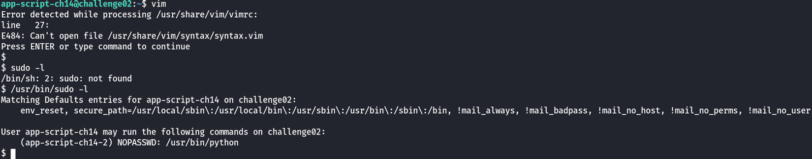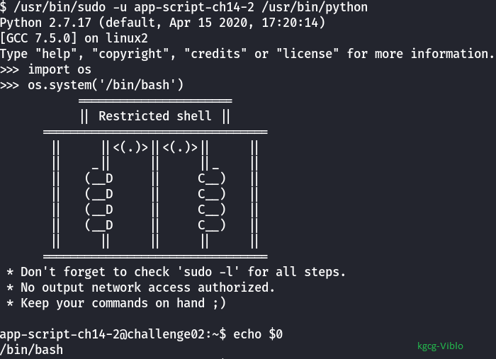 User app-script-ch14-2 (có lẽ ngụ ý là level 2) có thể chạy /usr/bin/python với quyền sudo mà không cần nhập password. Dùng python để spawn một bash shell:
