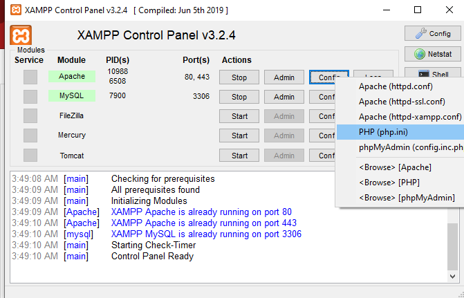 Để tìm file php.ini chỉ cần vào Xampp và chọn config ấn tổ hợp phím ctrl + F, cửa sổ tìm kiếm hiện ra, ta tìm hai từ khóa trên và đổi giá trị sang On.