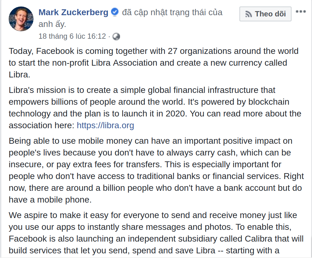 Chỉ với một dòng trạng thái của Mark Zuckerberg về nến tảng Libra cũng như đồng tiền số sắp được chính thức sử dụng của Facebook đã làm cộng đồng Blockchain sôi động trở lại. Bài viết này mình sẽ giới thiệu tổng quan cho các bạn về nền tảng phát triển cũng như đồng tiền kĩ thuật số sắp được phát hành bởi cộng đồng Facebook và rất nhiều những công ty công nghệ lớn.