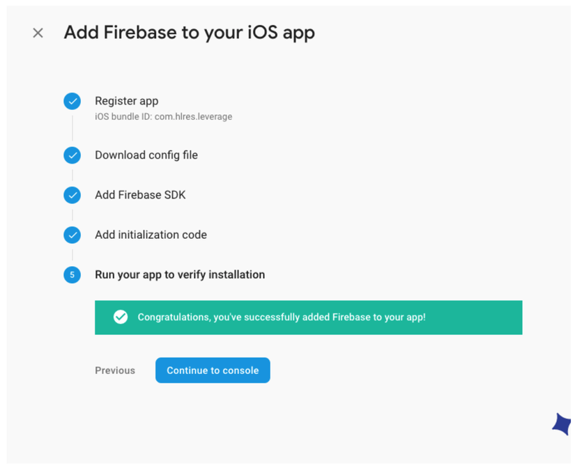 Ở bước add SDK anh em nên build App lên điện thoại để quá trình kết nối giữa iOS và Firebase diễn ra, nếu thành công thì sẽ hiển thị theo bên dưới.